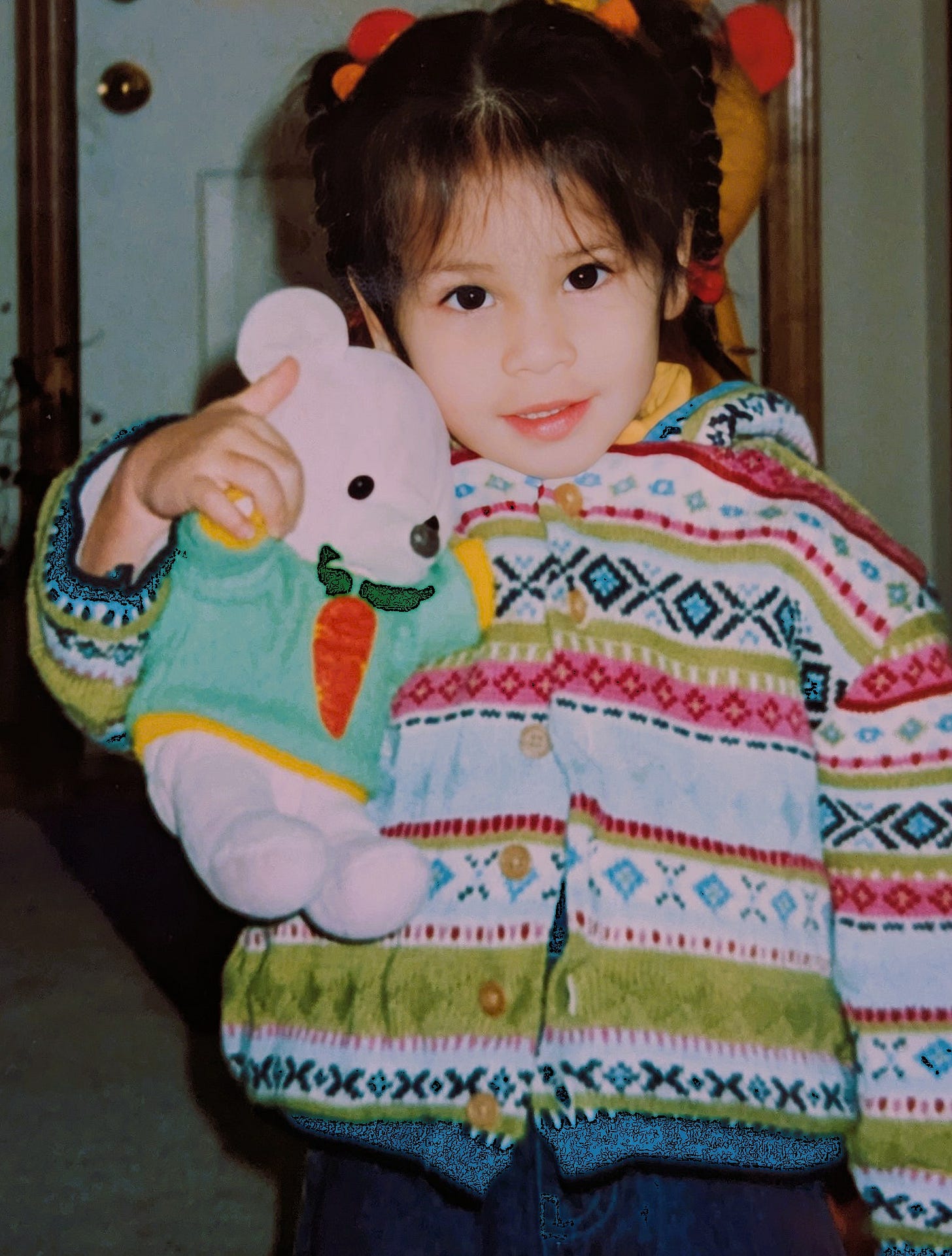 BeBe was so well-loved that he was routinely falling to pieces. I was constantly sewing up holes and restuffing BeBe. I would even knit sweaters for BeBe to help hold his insides in. At some point, BeBe got a new nose and his mouth disappeared. I joked that–just as our own bodies are constantly replacing our old cells–Bebe had been completely replaced several times over.