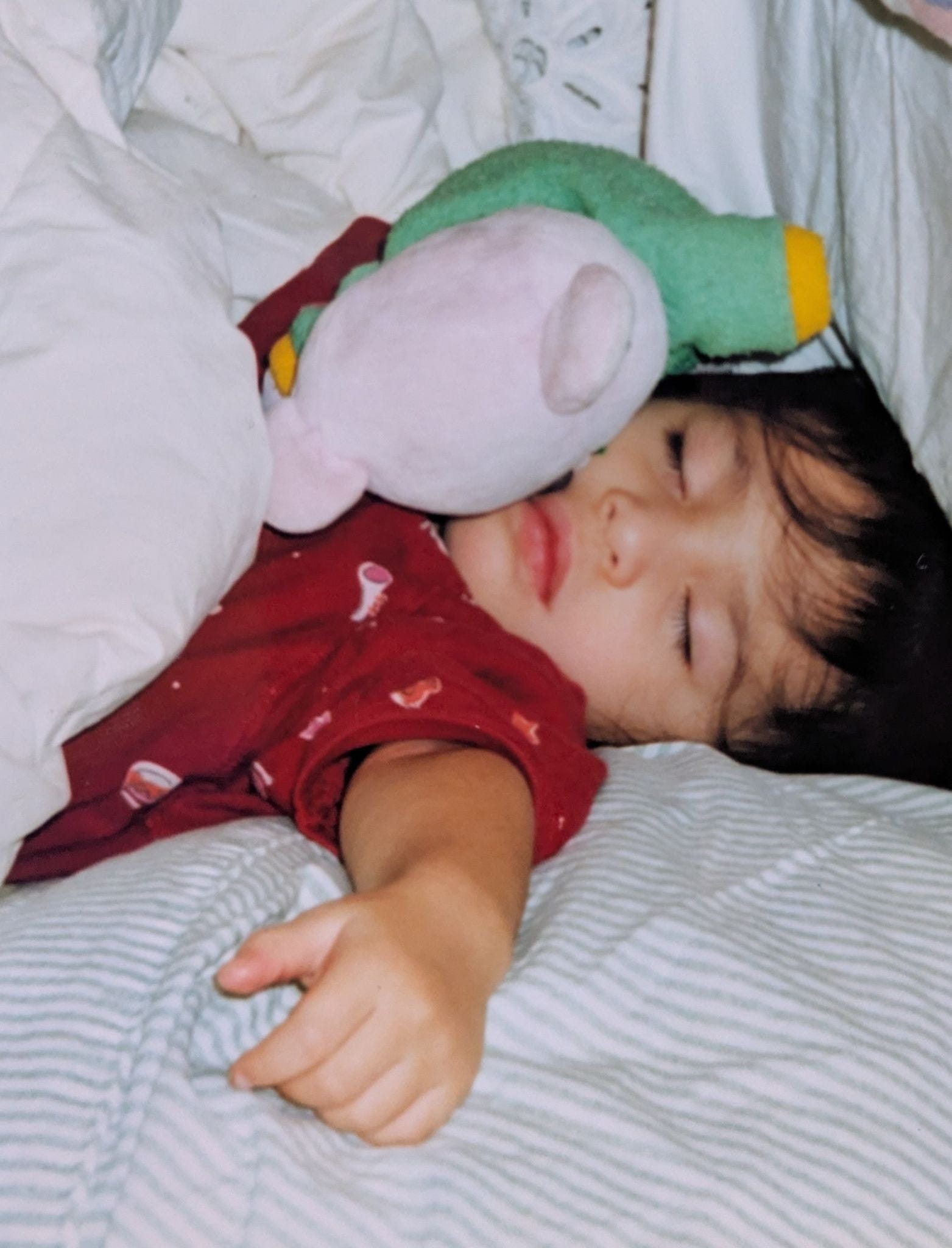 BeBe was my younger daughter’s constant companion throughout her early years, visible in nearly every family vacation photo ever shot. Once, while hiking in Rocky Mountain National Park, we had gone a mile up a very steep trail when M suddenly realized that BeBe was missing. She was inconsolable. We ended up hiking all the way back to the car, where we all breathed a sigh of relief upon finding BeBe safe in the backseat.