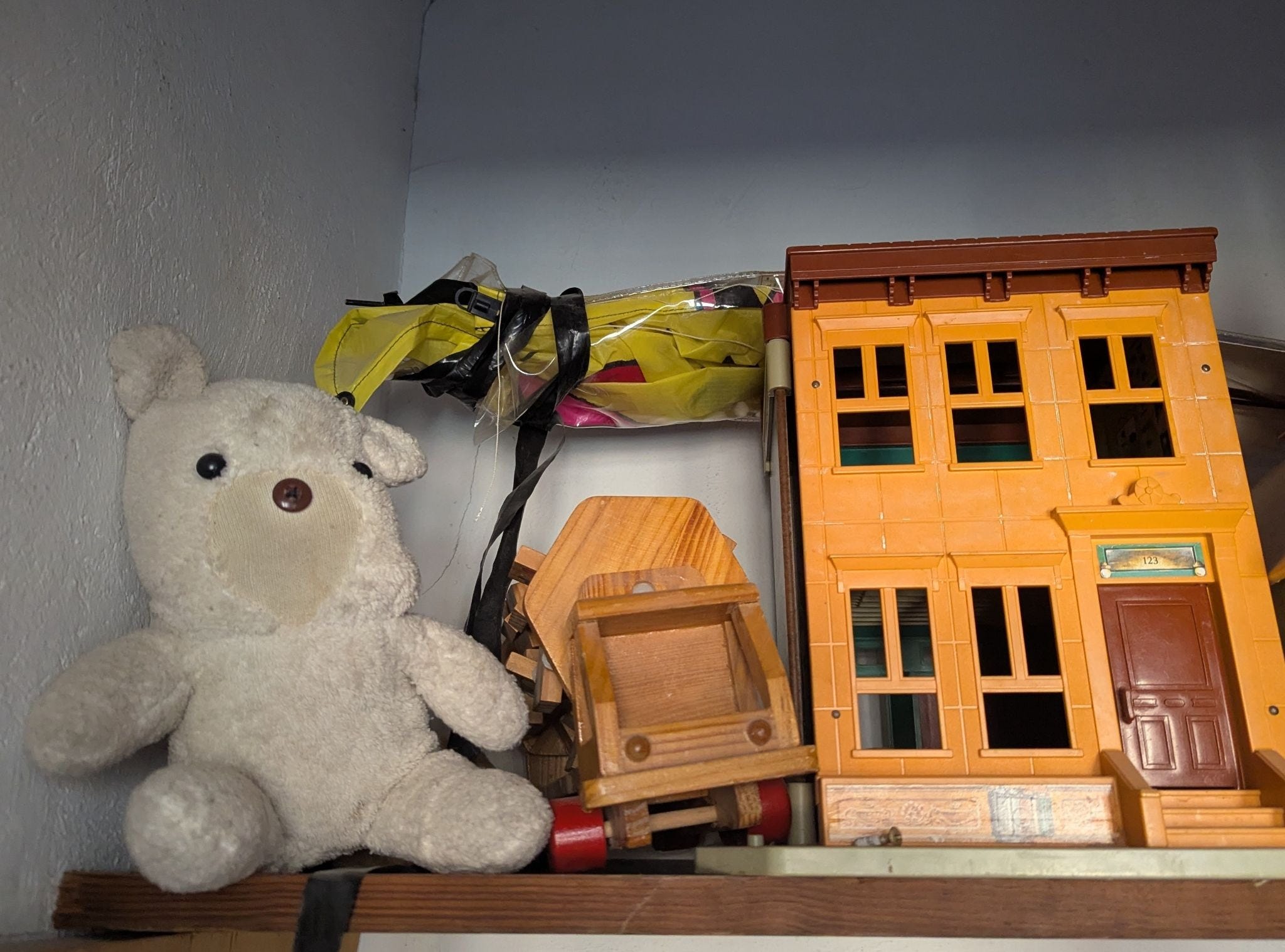 M stopped sucking her thumb that same night, after we visited the orthodontist. She later shared how she had accomplished this feat. She told me as she lay in bed that first night, consciously willing herself not to suck her thumb, she could not get comfortable. With BeBe occupying the crook of her neck, she kept finding her thumb creeping toward her mouth. After some period of tossing and turning, she made up her mind. She could not do this with BeBe. She got up out of bed and put BeBe on the shelf. Then she returned to bed and fell asleep. She never sucked her thumb again. BeBe remained on the shelf.